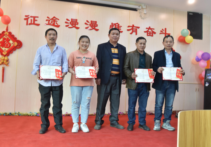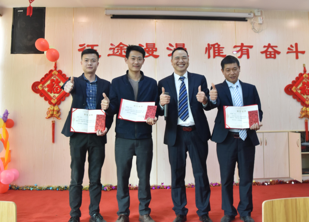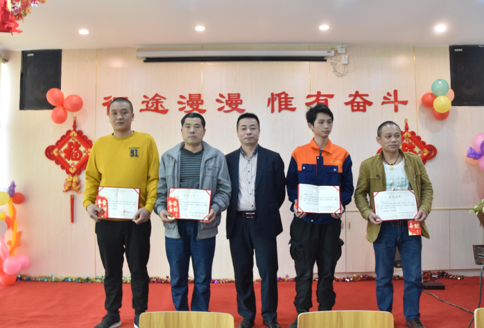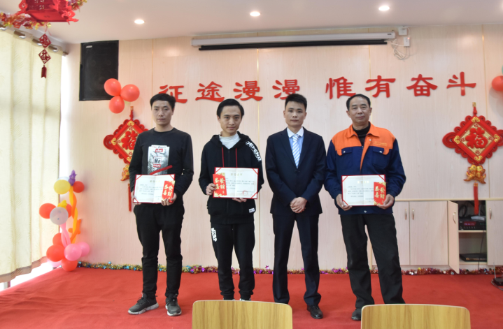 生產(chǎn)部經(jīng)理陽專為周偉群、胡勇波、李加龍、唐江明頒發(fā)先進(jìn)個人獎