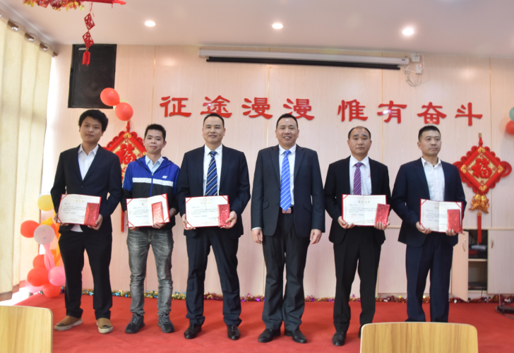 生產(chǎn)部經(jīng)理廖小強(qiáng)為伍志強(qiáng)、柳敏捷、戴剛、韋進(jìn)勇頒發(fā)先進(jìn)個人獎